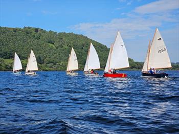 Six boats in line on a broad reach during the Gaffling Dinghy Championship at Ullswater