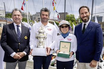 Dr Sam Haynes, Commodore of the CYCA; Alexis Loison and Jiang Lin co-skippers of the overall winning yacht Min River; Eduardo Maclean, Rolex Australia