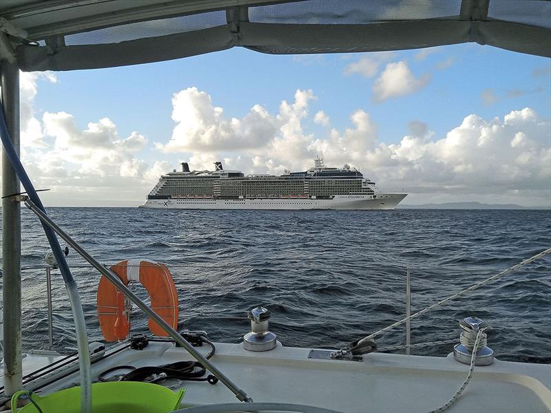 Imagine our surprise as we stepped into the cockpit the next morning to find not one, but four ENORMOUS cruise ships lined up just a few hundred meters astern of Contigo. They had crept up on us in the small hours as we slept the sleep of the dead, and three had dropped their huge anchors in what we can only hope was a coral-free spot. The fourth was holding itself stationary using dynamic positioning (clever technology used on cruise ships, research vessels etc. to remain in one place using engines and thrusters, without the Captain having to sweat over the controls). This was the origin of the strange vibrations we had felt in the cabin, and also a large fog of exhaust fumes that were hanging over the bay. Our hopes of a couple of days playing tourists on the island were quickly dashed, as we calculated that there must have been upwards of 10,000 visitors, probably more, and the chances of us getting a spot on one of the tours were non-existant. We ate our breakfast in silence, staring up (and up, and up a bit more) at the floating skyscrapers complete with flumes, outdoor cinemas and... was that a golf driving range?!