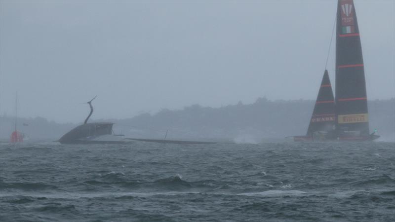 Luna Rossa sails past American Magic, in the rain squall, as Patriot's mast hits the water after capsizing at 47kts - Hauraki Gulf - January 17, 2021 - Prada Cup - 36th America's Cup © Richard Gladwell - Sail-World.com / nz