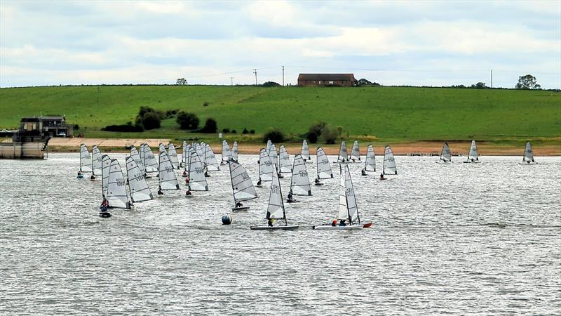 Fortified by the mandatory breakfast butty, Race 1 saw a clean start of 68 boats and a zigzag course up the full length from causeway to dam. This gave relatively short beats but sufficient to give the fleet options in chasing differing wind patterns. Using the middle of the reservoir seemed to pay off better than heading straight for the southerly shore. The leading half-dozen made a clean turn round the windward mark onto the reach although as inevitably happens with such a large contingent, the middle of the fleet bunching at the first mark was the moment to demonstrate your ability to maintain clean air. With the separation of the fleet at this point, the first race showed a very clear front, middle and tail end but even so there wasn't much time elapsed between first and last. With a long and fast reach down the pool to the leeward mark, this allowed the lighter helms to make up for their larger counterparts' advantage on the beats. The race was finished at one of the middle windward marks and was won by Cliff Milliner with Iain Horlock and Andy Flitcroft second and third respectively.