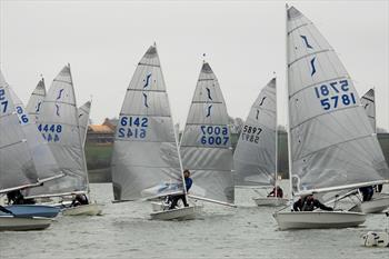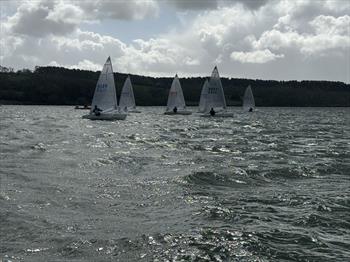 The competitors were greeted with a light drizzle and heavy clouded skies, but the temperature was an acceptable 12 degrees C. Driving in, the sailors were keeping an eagle-eye on the trees and on the M40 I can report that there was very very little breeze but on reaching the lake we were greeted by a very pleasant 8 to 10 knots out of the north east which was blowing directly down the length of the lake. Some of the allegedly knowledgeable locals said that this wasn't a great direction, but to my eye, looked pretty well spot on.