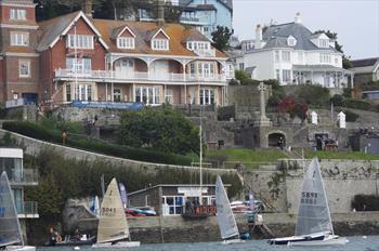 Honnor is carting down the line but with the pin as congested as a Pug with a cold he goes bow-down into a fast closing space between a raft of Solos which are lined up on starboard, the subsequent penalty turns putting him last over the line as the gun goes.
