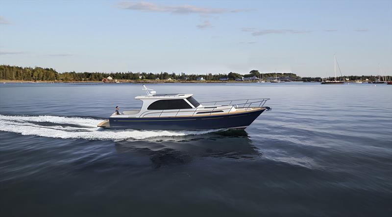 The profile is clean and intentional. A curved windshield and long, continuous cabin portlights create a sleek visual flow, while a subtle drop in sheer is balanced by added flare forward. The result is a silhouette that feels low, purposeful, and unmistakably contemporary. Beneath the surface, a cold-molded wood composite hull paired with an infused carbon fiber superstructure delivers an exceptional balance of strength, ride quality, and reduced weight, supporting a projected top speed of 42 knots.
